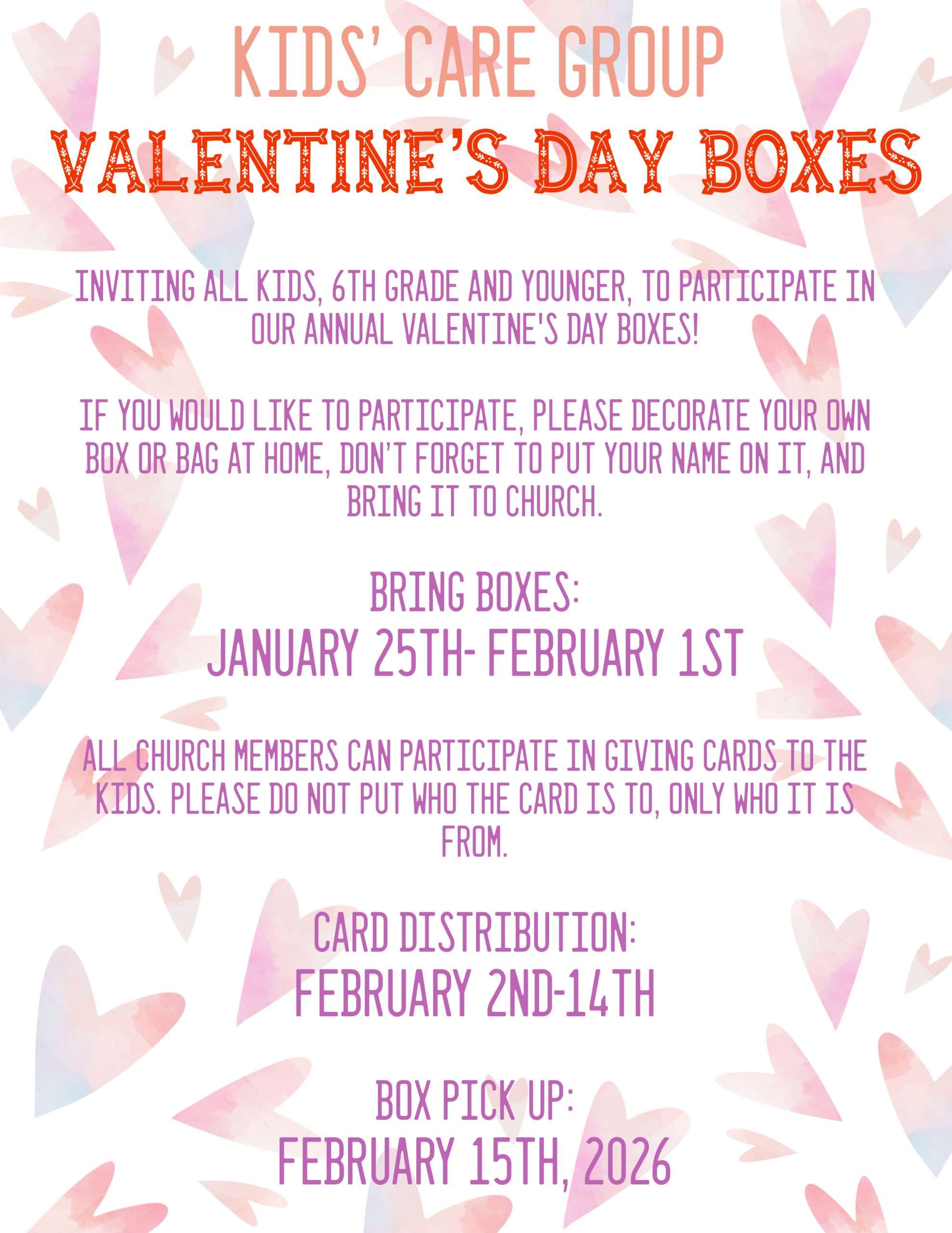 Kiddos enjoy decorating boxes/bags and exchanging cards, as well as all church members being invited to give out Valentine‘s cards.