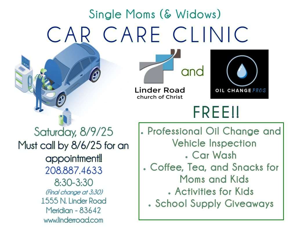 Linder Church Car Care Clinic is open to only Single Moms & Widows. If you are interested or have any questions please reach out at 208.887.4633.